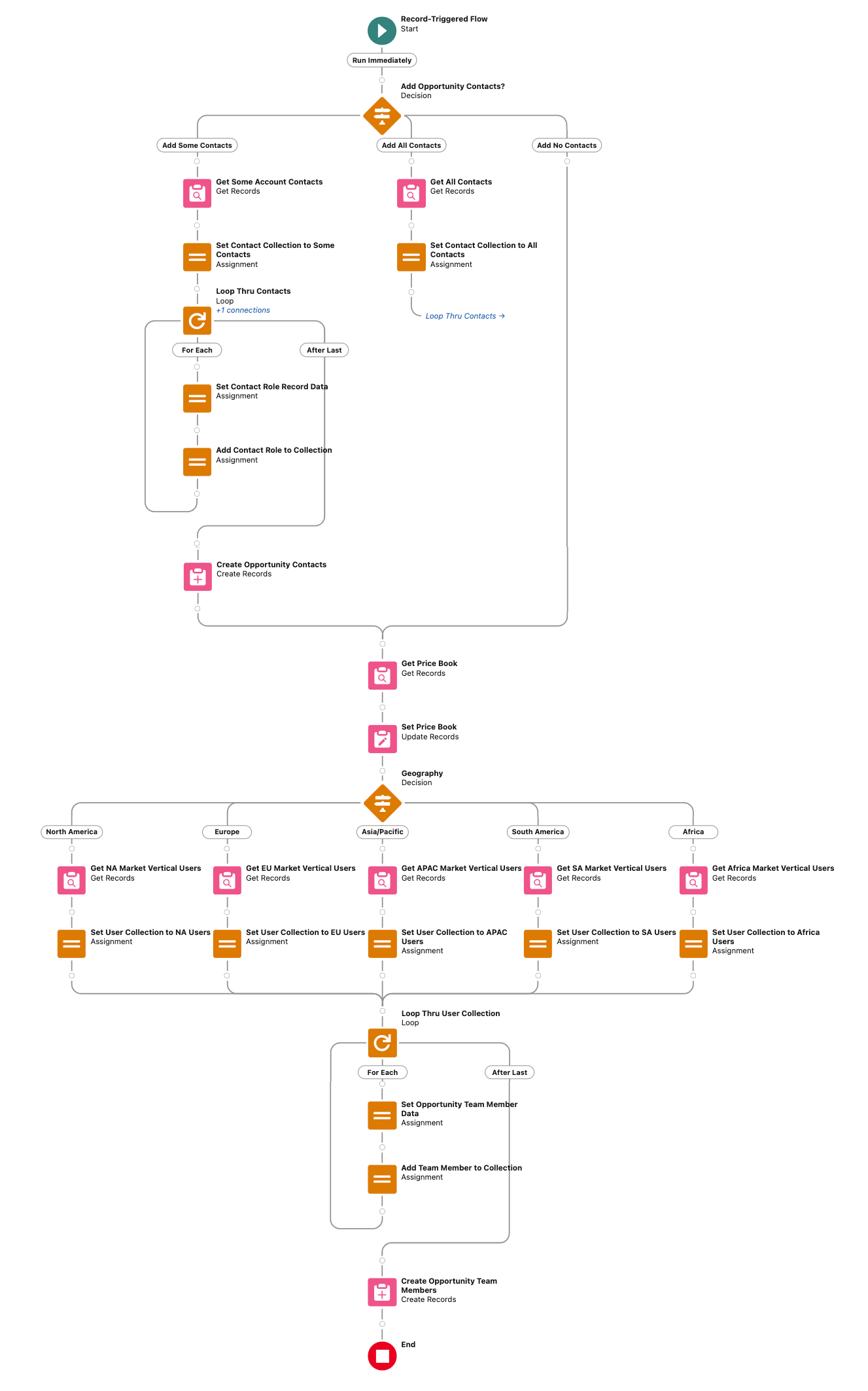 Sometimes, you need automations that do a lot of heavy lifting. Maybe when you create an Opportunity, you need to Salesforce add certain Contacts associated with Accounts that meet certain criteria as Contact Roles, set the Opportunity’s Pricebook based on the Account billing address, and add certain Users to the Opportunity Team based on certain attributes of the Account. You could put all of this logic in a single flow. If you did, it would look something like this:
