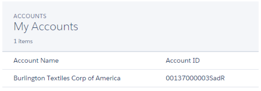 In the snippet above we define the header and the primary content. The header just shows a label and an indicator of how many records are shown. The primary content is a table displaying Account Name and Id. We also have a few slds classes on the page. Primarily the slds-page-header for the header and slds-table for the table. There are also a few helper classes for text sizing and making the table bordered. With a little over a dozen lines of HTML and a few classes we get an awesome looking page.