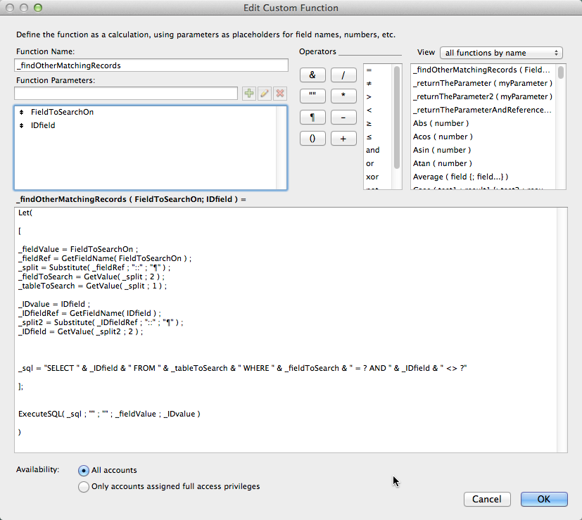 The values of myField and ID for the current record will be inserted into that function call. But this syntax has one big drawback: the names of the myField and ID fields, and the name of the Table Occurrence are hard coded into the SQL syntax. If you ever decide to change the name of the TO or a name of one of the fields, then the ExecuteSQL function will fail. To protect against that you can extract the TO and field name from a field reference. So to make the SQL query work AND make it change-safe, we need to know the field’s value and also its field reference. And that is exactly what we can get from a custom function. The custom function below takes two parameters: the field to search on and the ID field. From each of those parameters the custom function can extract both the value and the field’s reference. For the field named “myField”, the value is “Lloyd” and the field reference is “myTable::myField”. From the field reference it is easy to parse the TO name and the field name.