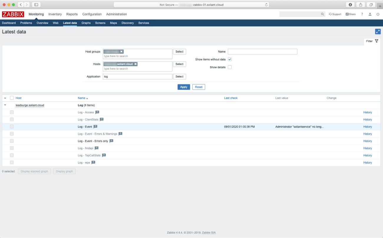 Navigate to Monitoring > Latest data. Make sure Host groups and Hosts are set, filter the Application field to “log,” and click Apply. You should see the last value retrieved displayed to the right of Log – Event. If so, click the History link on the far right. This should give you a filterable display of the FileMaker Server Event Log.