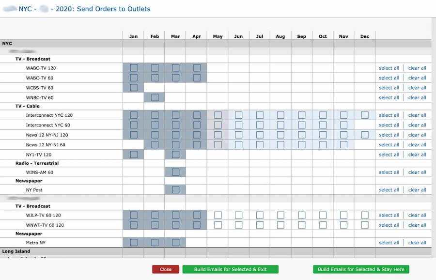 With a bunch of orders made and ready to go, across multiple months’ Media Plans, they needed a way to send all those orders off to the stations and papers easily. We had a batch-sender that would send all pending orders in a single Media Plan, but that wasn’t fully safe to use. They might have other orders not ready to send when they want the annuals to go out, which left them having to go to every single order individually, clicking Send on each one. That could be dozens of orders at a time, and if they were in the thick of annuals, it could take hours to send things out.