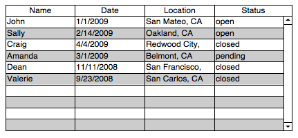 Hopefully it’s a given that this second version is at least somewhat more attractive, but beyond making it pretty, notice the strategy of peeling away elements. Obviously I’ve removed some of the lines. Your eye can infer the vertical columns in a grid this small: you don’t actually need the verticals. It’s useful to leave the horizontal lines to communicate that these elements are rows as opposed to simply a single formatted block of text. The alternating row shading, a throwback to the accounting-green tractor fed printers of 1000 years ago, is also unnecessary: in a grid this small, it’s just clutter. Your eye can easily differentiate between rows. Notice too that I punched back the gray of the grid lines and the font color of the headers. Again, the goal here is to inform, but reduce noise and draw the user’s eye to what’s important. The darkest text is the actual data in the grid, with gray used to guide without fighting for attention. Just these three steps – remove extraneous lines, remove the alternating shading, and drop back colors used for labels and lines – has, I’d argue, made a big difference. I’d recommend finding ways to make the screens in your databases less noisy, less cluttered. Your users will thank you for it, perhaps even without really recognizing why.